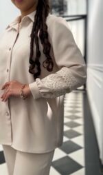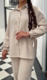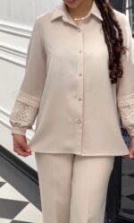 جنس شومیز و شلوار جذابمون کرپ بسیار با کیفیت و درجه یک هست.شلوار کامل لایی کشی شده.روی آستین شومیز یه تور خیلی قشنگ کار شده.