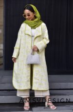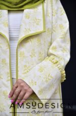 جنس این مانتوی خوش آب و رنگمون ژاکارد نخ بسیار خنک و تابستونی هست.زمینه ی کار سفید هست با طرح های سبز که با اریب های سبز دور یقه و دور مانتو ست شده.