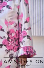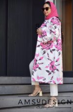 برای این مانتوی زیبامون از پارچه ی ژاکارد استفاده شده. زمینه ی پارچه صدفی خیلی روشن هست با طرح های سرخابی و مشکی