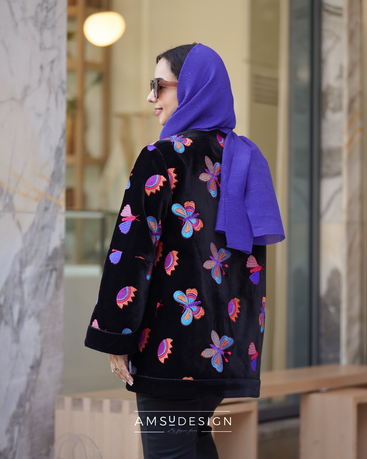 کت مخمل سوزن دوزی قشنگمون به صورت کامل لایی کشی شده. سر آستین ها و لبه ی مانتو مغزی دوزی شده.