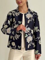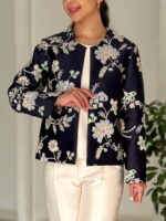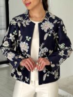 زمینه ی کت ژاکارد هست.روی پارچه گلدوزی و پولک دوزی شده.پارچه وارداتی و با کیفیت بسیار بالا هست.کت کامل لایی کشی شده