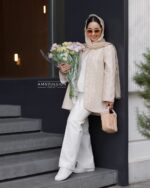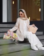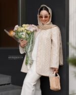 جنس این کت قشنگ کسمه لینن هست.این پارچه اصلا چروک نمیشه و آبرقت نداره.تمام پارچه سوزندوزی شده.لبه های جلو و آستین ها مغزی دوزی شده